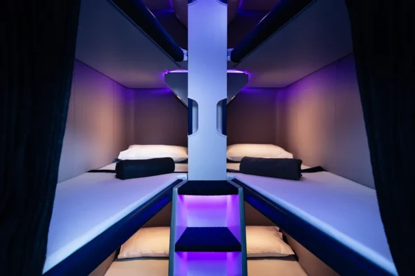 The individual alcoves will have a lie-flat bed with a soft mattress, pillow, sheets, blanket and a seatbelt. There will also be USB outlets, a reading light, cooling ventilation and a privacy curtain. The space measures about 80 inches long and 25 inches wide. (On the airline’s website, they are quick to assure passengers that the sheets are changed out after every person and that ‘cuddling’ is not allowed.)