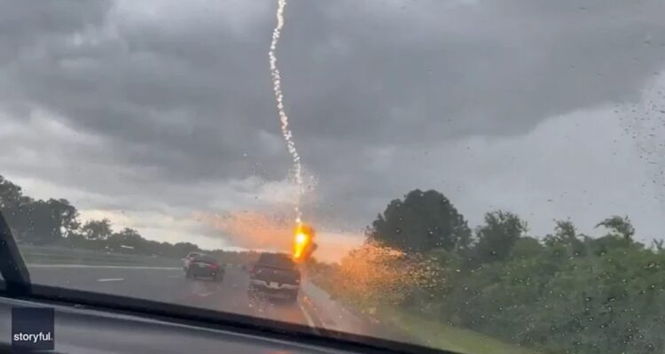 Imagine you’re following your husband in his truck and decide to randomly video tape and — BOOM!– the truck is hit by a lightning bolt!