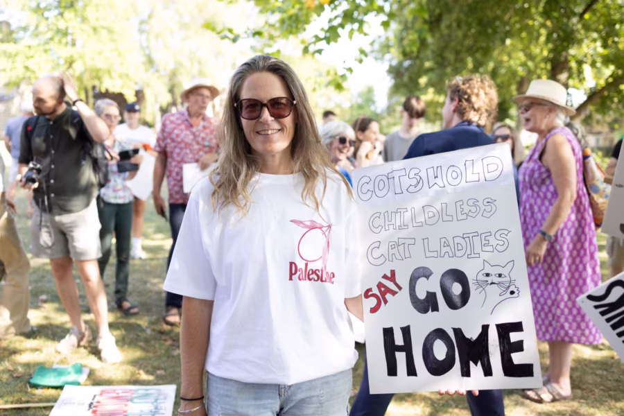 “He’s simply not welcome here,” said Sue Moon, a therapist from nearby Chipping Norton, who was carrying a placard reading: “Cotswold childless cat ladies say go home” – a reference to Vance’s insulting remark about Democrats.