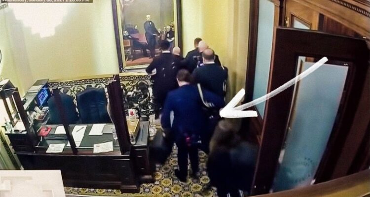 In new security footage shown at the Impeachment trial, VP Mike Pence is rushed by his security detail away from the rioters, and for the first time, you see a military officer carrying the so-called ‘nuclear football.’