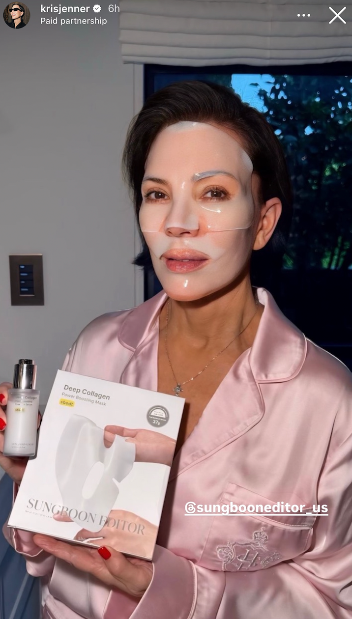 Kris Jenner–approved skincare moment that hit Instagram and TikTok today. Kris featured herself using the SUNGBOON EDITOR Deep Collagen Power Boosting Mask and Cream-in-Serum, putting a spotlight on the brand’s ultra–low molecular collagen technology and its role in her routine.