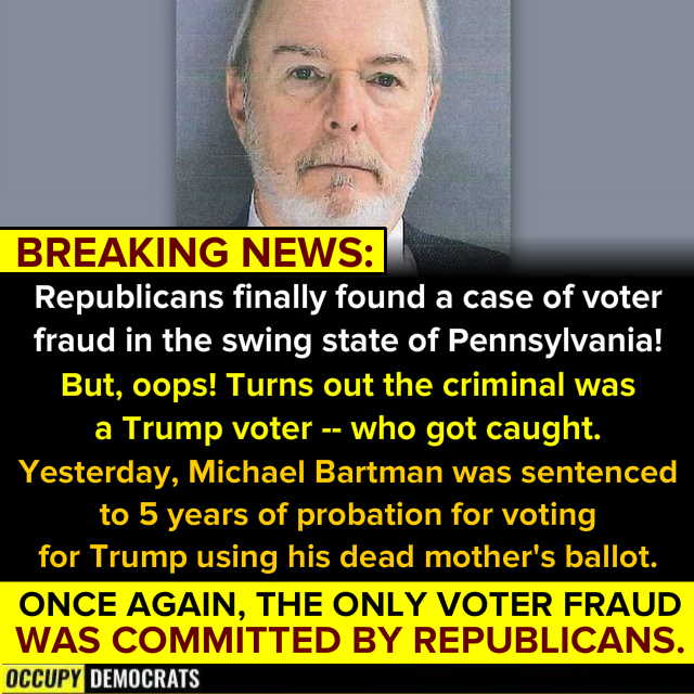 The Washington Post reports that “In addition to Bartman, two other men in Pennsylvania face charges of fraudulently voting for Trump, according to the [Philadelphia] Inquirer. Ralph Thurman of Chester County allegedly tried to cast his son’s vote and Richard Lynn of Luzerne County allegedly attempted to obtain an absentee ballot for his deceased mother. Both cases are pending.