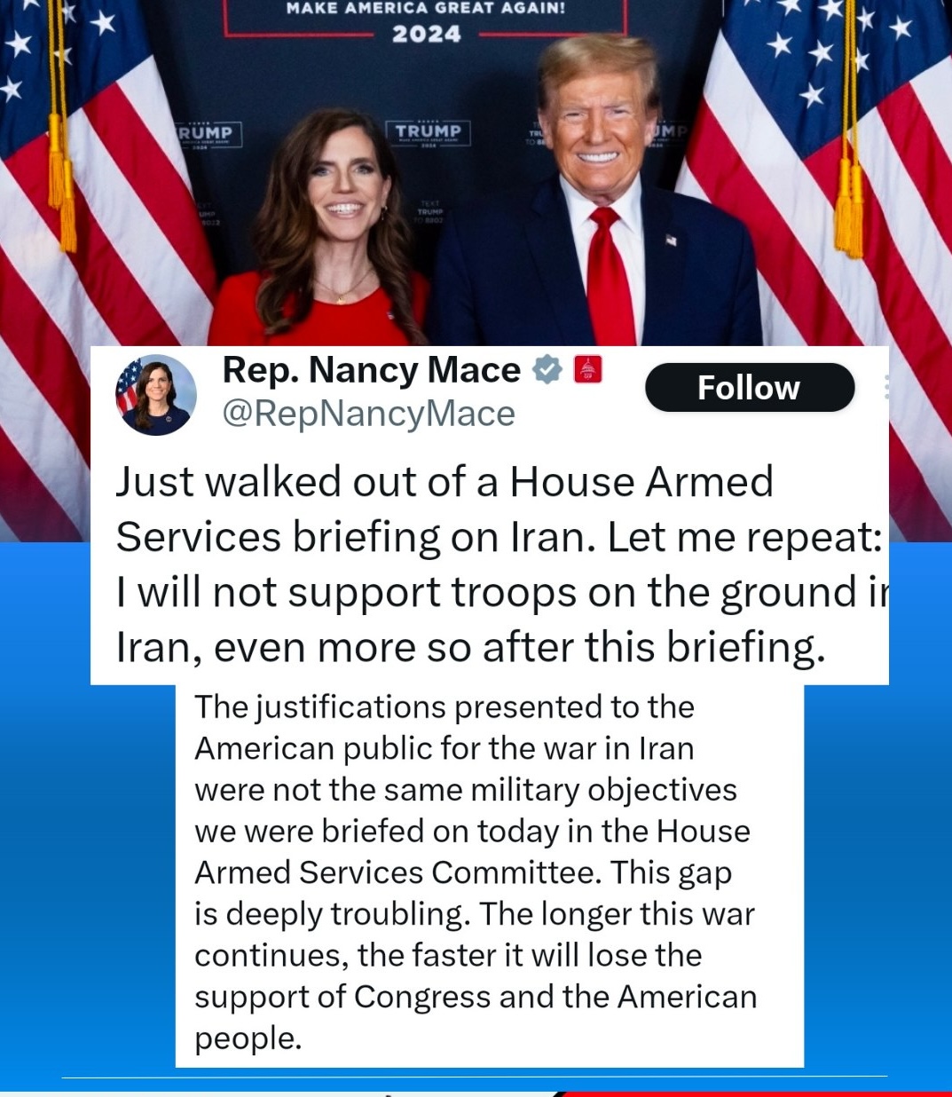 Later, Mace wrote on X: ‘The justifications presented to the American public for the war in Iran were not the same military objectives we were briefed on today in the House Armed Services Committee.’