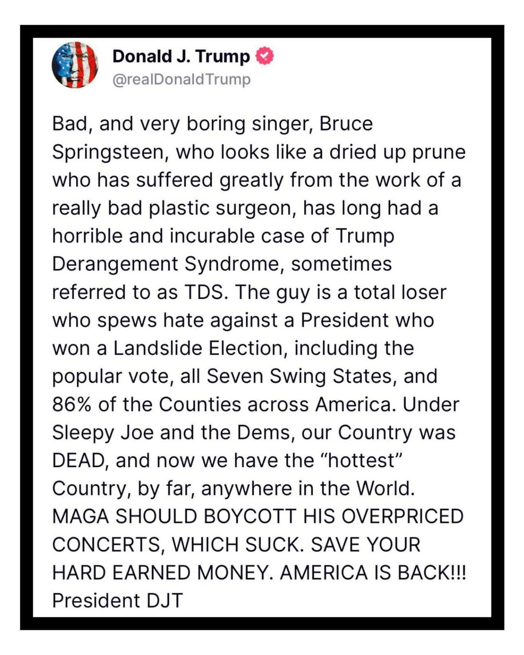After Bruce Springsteen, a vocal critic of Trump, announced his new tour, an annoyed Trump railed against ‘The Boss’, calling him a “dried up prune” and saying he has “long had a horrible and incurable case of Trump Derangement Syndrome.”