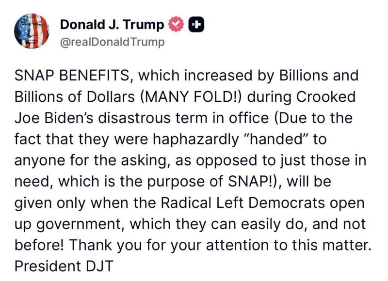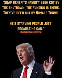 Tuesday, on social media, Trump threatened to withhold the food program known as SNAP, which feeds about 42 million Americans, writing, “(they) will be given only when the Radical Left Democrats open up government, which they can easily do, and not before!”
