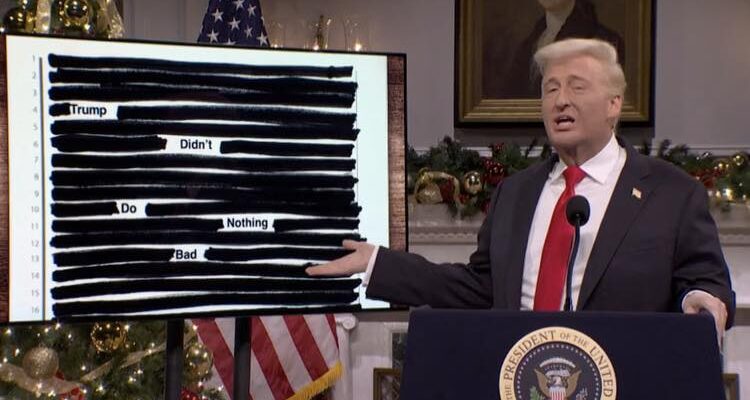 President Trump (James Austin Johnson) performed a Christmas address to the nation, where he satirized numerous subjects, for instance, the Epstein files, boasting as he displayed heavily redacted documents on screen: