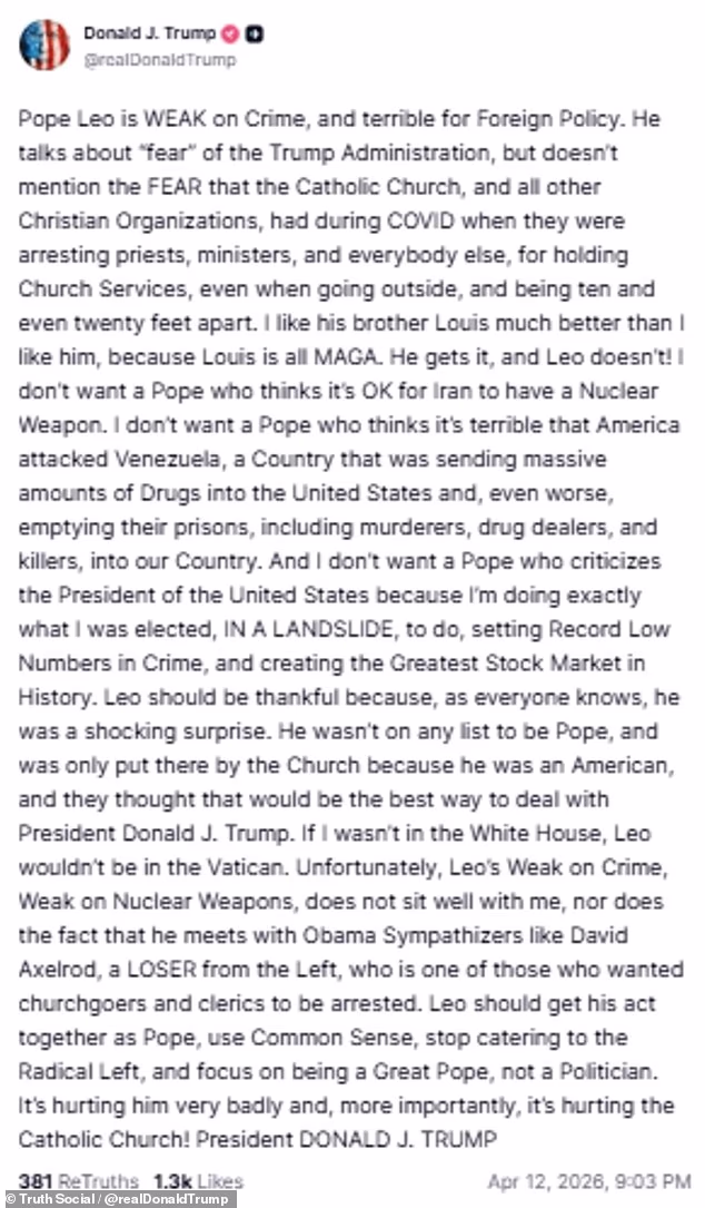 The short version: Trump has attacked Pope Leo XIV after the Pontiff spoke out against his war in Iran, condemning Trump’s threat to kill Iran’s “whole civilization” as “truly unacceptable.”
